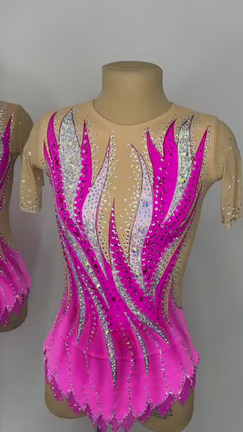 Ignite the floor in a piece designed to command attention from every angle. This striking leotard fuses sculptural elegance with explosive colour, featuring vivid fuchsia and blush tones that radiate upward in a flame-like burst, elongating the body and enhancing every movement.